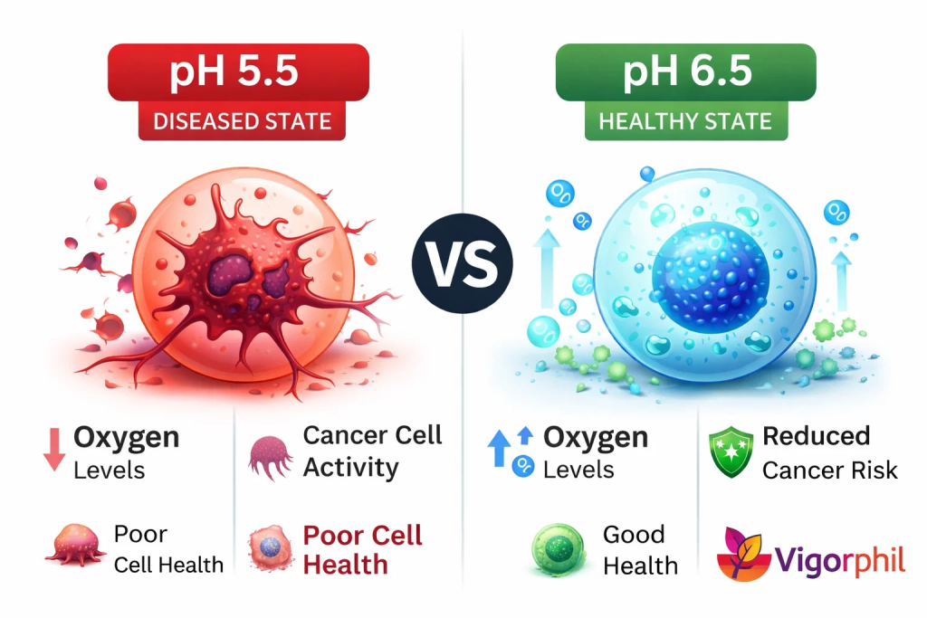 At pH 5.5, disease thrives. Yeast, fungus, and cancer grow rapidly in this acidic environment. When cellular pH drops by just one point, oxygen availability decreases by sixty percent.